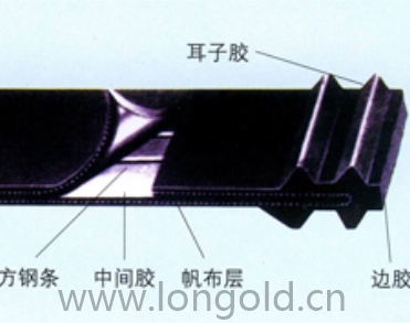 ◎ 沿膠帶橫向鋪設方鋼條,其間以橡膠填充,用膠布包覆成為帶芯,并覆蓋上、下覆蓋層,在由此構成的帶體兩邊設置耳膠,邊膠。