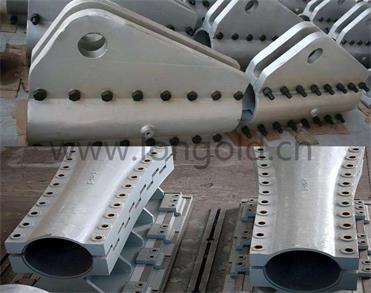 ◎ 主纜和吊索的連接一般采用剛性索夾把主纜篐緊,產生收縮變形時也不致滑動。索夾多采用來兩個鑄鋼半圓構件,當每對半圓索夾安裝在主纜上之后,用高強螺栓對接。可以分為上下兩半,也可分為左右兩半。